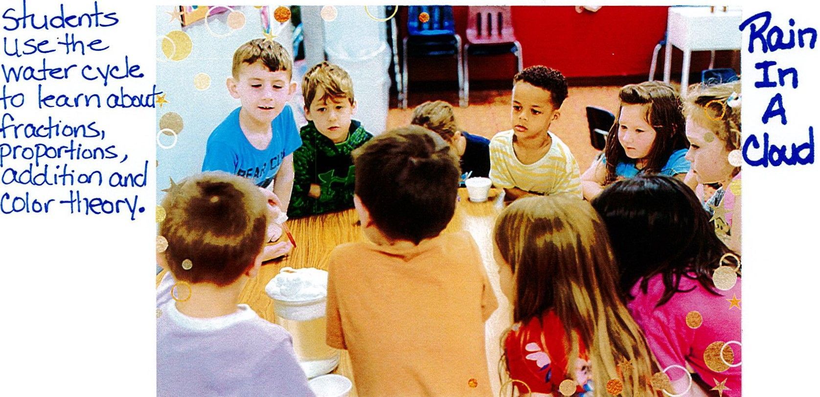 Students use the water cycle to learn about fractions, proportions, addition, and color theory. By measuring out the parts needed of shaving cream and water using a breaker, as well as counting the droplets that enter the cloud using a dropper. Then by using primary and secondary colors they create tertiary colors and watch them flow down like rain.